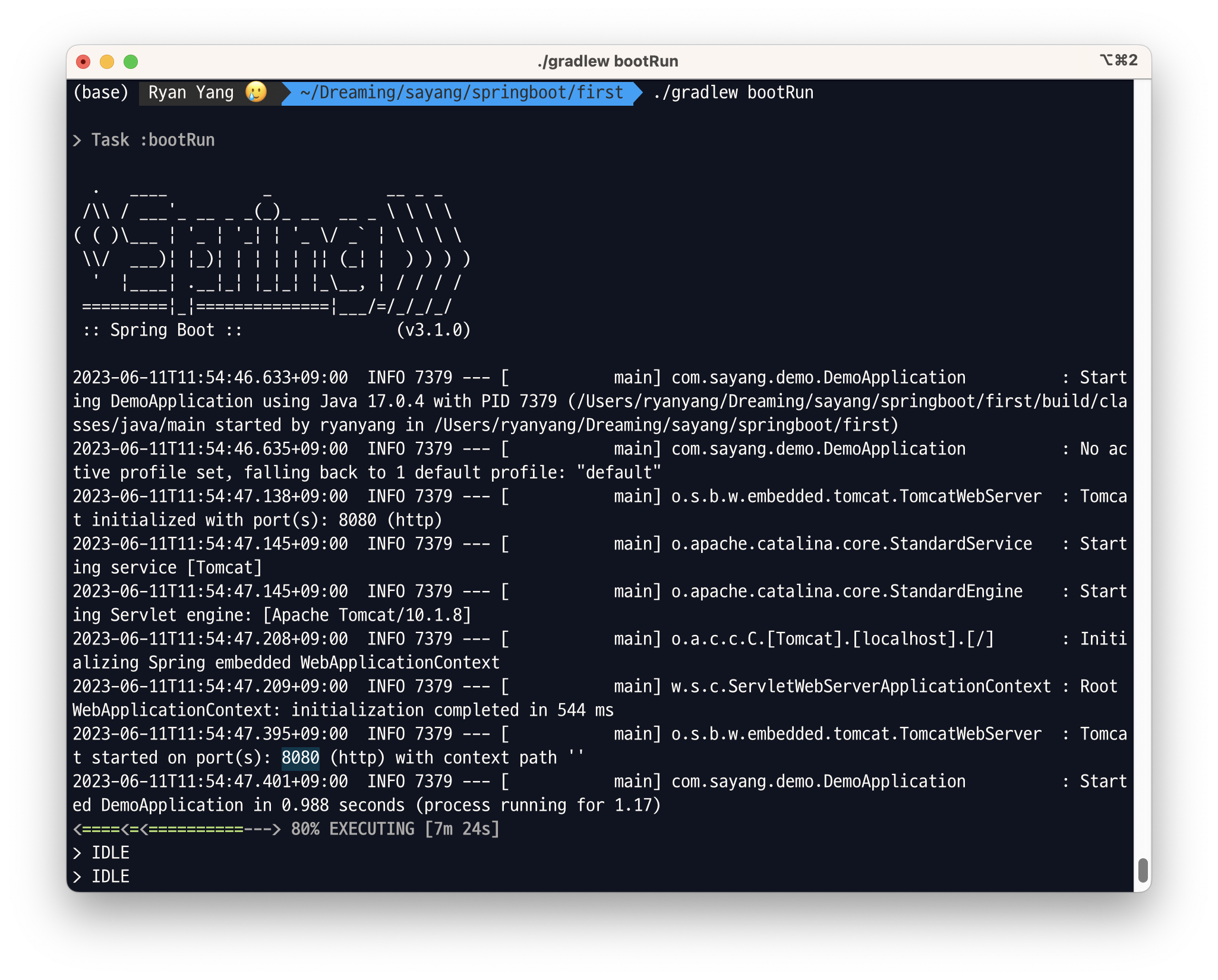 Once you write your code, then type ./gradlew boot run, you can boot up your Spring Boot application with a lot of messages. You can see the w.s.c.ServletWebServerApplicationContext and o.s.b.w.embedded.tomcat.TomcatSebServer. It shows the domain and port number where you can access your web application on a browser.