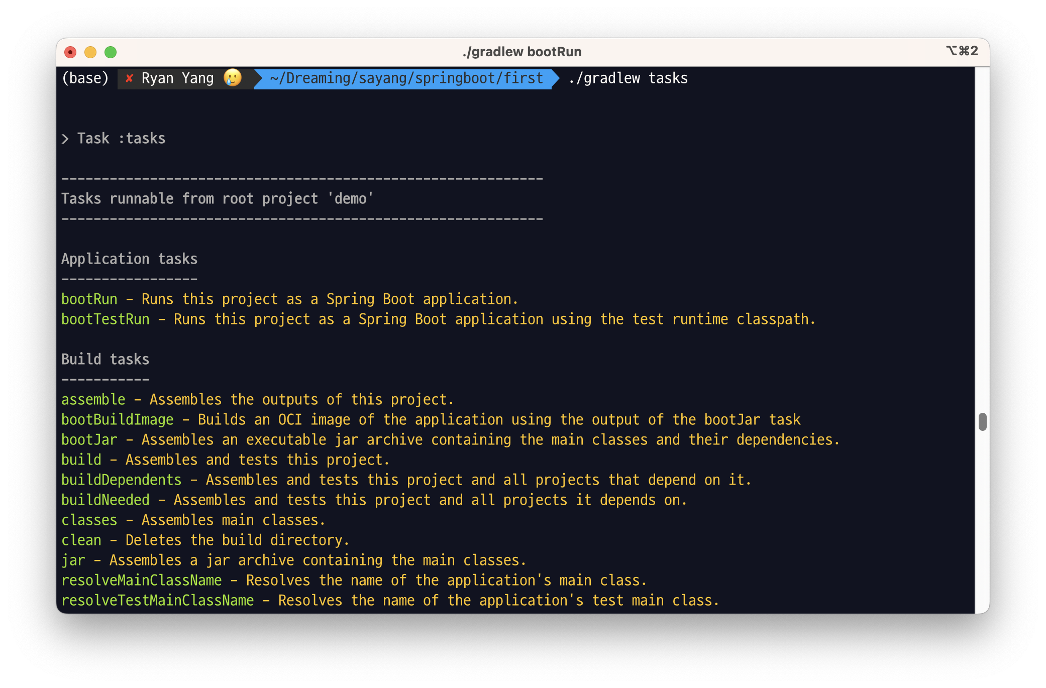 When you download and unarchive the demo project from https://start.spring.io, there is an executable shell script called gradlew on MacOS. Even though, the Spring Quickstart Guide asks readers to type gradlew bootRun to start your Spring Boot application. I wonder how to list gradle commands for this project.